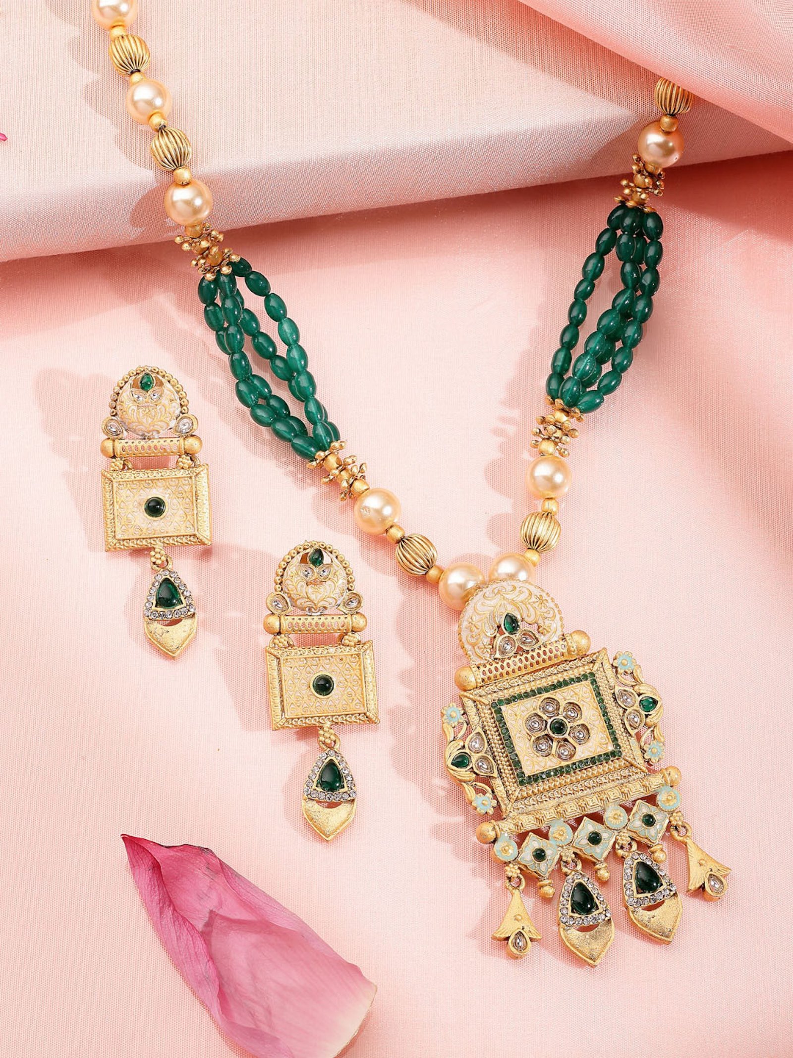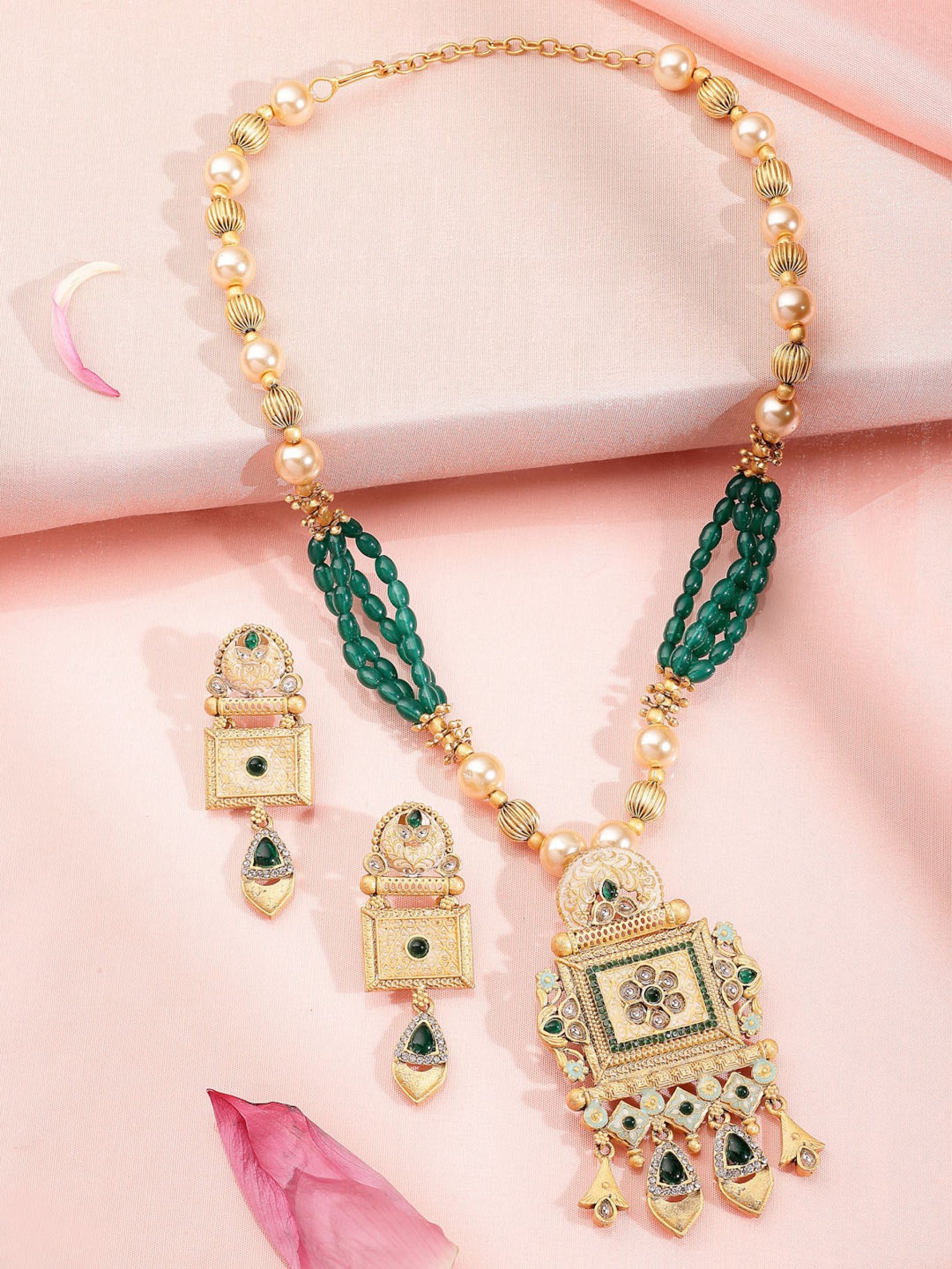 22K Gold-plated choker necklace, has green Kundan stone-studded & beaded details