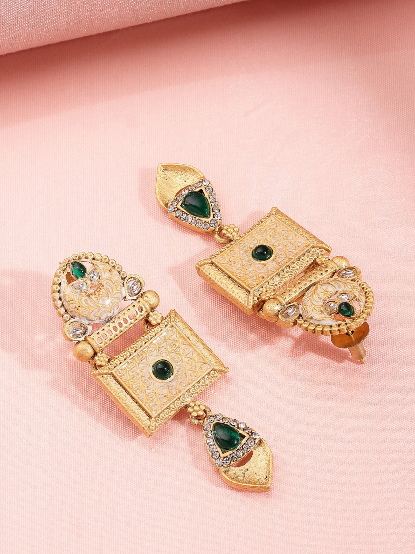 A pair of matching drop earrings, each secured with a post-and-back closure